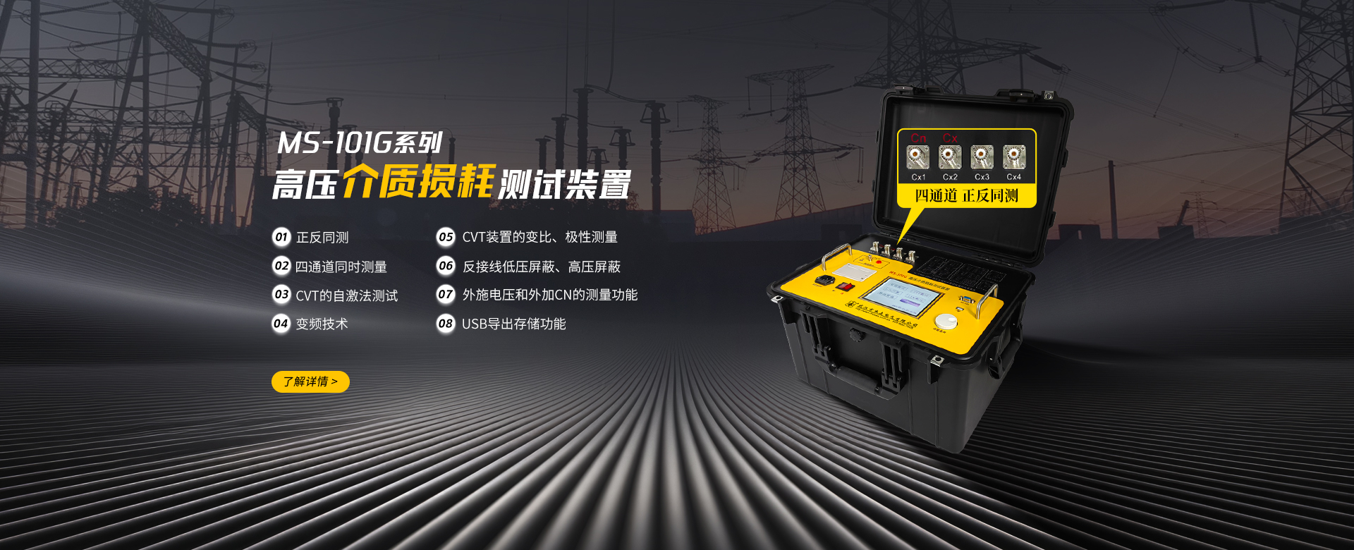 介損絕緣試驗可以有效地發現電器設備絕緣的整體受潮劣化變質,以及局部缺陷等,在電工制造、電氣設備安裝、交接和預防性試驗中都廣泛應用。MS-101G高壓介損測試儀采用變頻電源技術,利用單片機和電子技術進行自動頻率變換、模/數轉換和數據運算,達到抗干擾能力強、測試速度快、精度高、操作簡便的功能。變頻電源采用大功率開關電源,輸出單頻45Hz~65Hz及雙頻47.5Hz52.5Hz、45.0Hz55.0Hz、57.5Hz62.5Hz、55.0Hz65.0Hz純正弦波,自動加壓,可提供最高12kV的電壓;自動濾除50